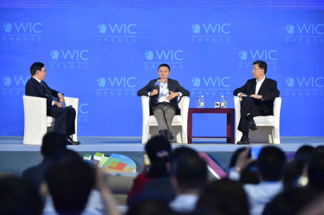 5月16日,阿里巴巴集团董事局主席马云(中)在天津举行的第二届世界智能大会主论坛上就人工智能的现状与未来进行发言。新华社记者 李然 摄