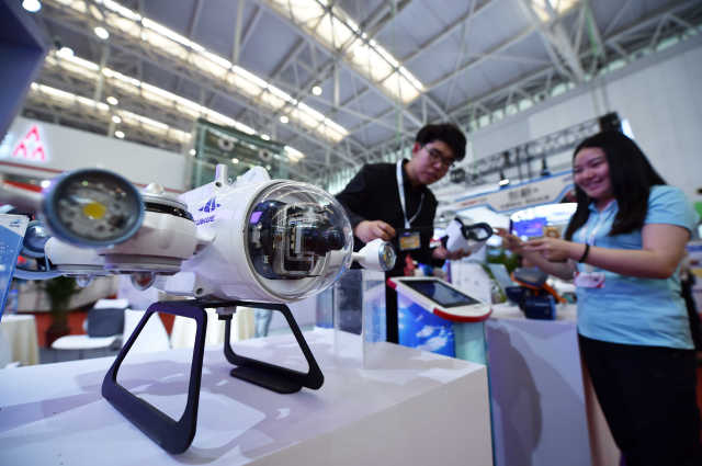 5月17日,观众在天津梅江会展中心智能科技展上参观深之蓝的水下机器人。新华社记者 李然 摄