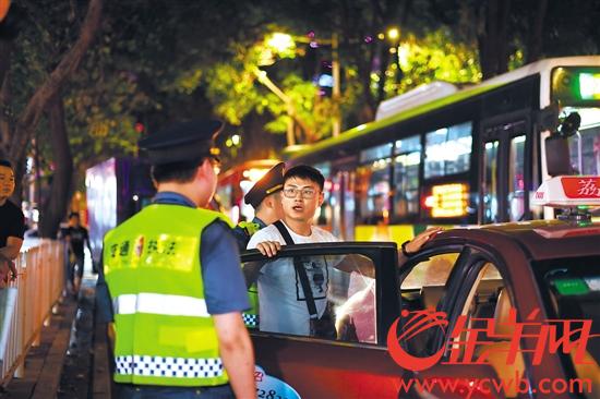 5月18日晚,广州交委执法人员在体育东路查处一辆异地营运的出租车 记者 周巍 摄