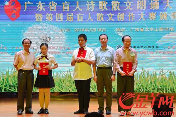 金羊网讯 记者黄宙辉,通讯员苗苗、秦晓婕摄影报道:在第二十八个全国助残日即将到来之际,广东省第八届盲人诗歌散文朗诵大赛决赛暨第四届盲人散文创作大赛颁奖典礼于5月18日在广东省立中山图书馆举行。最终,广州市的李安、汕头市的谢秋冬和余树骏获得广东省第八届盲人诗歌散文朗诵大赛的一等奖;广州市林英创作的《深井一对一》、佛山市何荣生创作的《眼镜情》获得第四届盲人散文创作大赛一等奖。