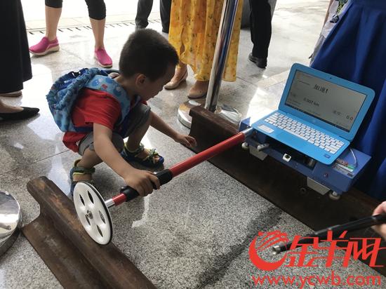 三岁半的安安就在一辆小车前一动不动了。这可不是玩具模型车,而是钢轨波磨小车,用于地铁钢轨波磨的检测和计算分析。“通过这个器具和配套软件,只用简单推拉,监测软件上的波纹数值,我们就可以知道钢轨平不平,磨损情况如何啦。”广州地铁技术人员饶先生和安安耐心地讲解。虽然听不太懂,但安安还是听从技术人员的指引,自己去推拉小车,十分开心。“他一直对科学技术比较感兴趣,今天本来是打算带他来广州地铁博物馆的,恰好遇到这个活动,就过来参加了。”安安妈妈说,“这种活动很不错,既生动又接地气地向市民普及科学知识,多多益善。”