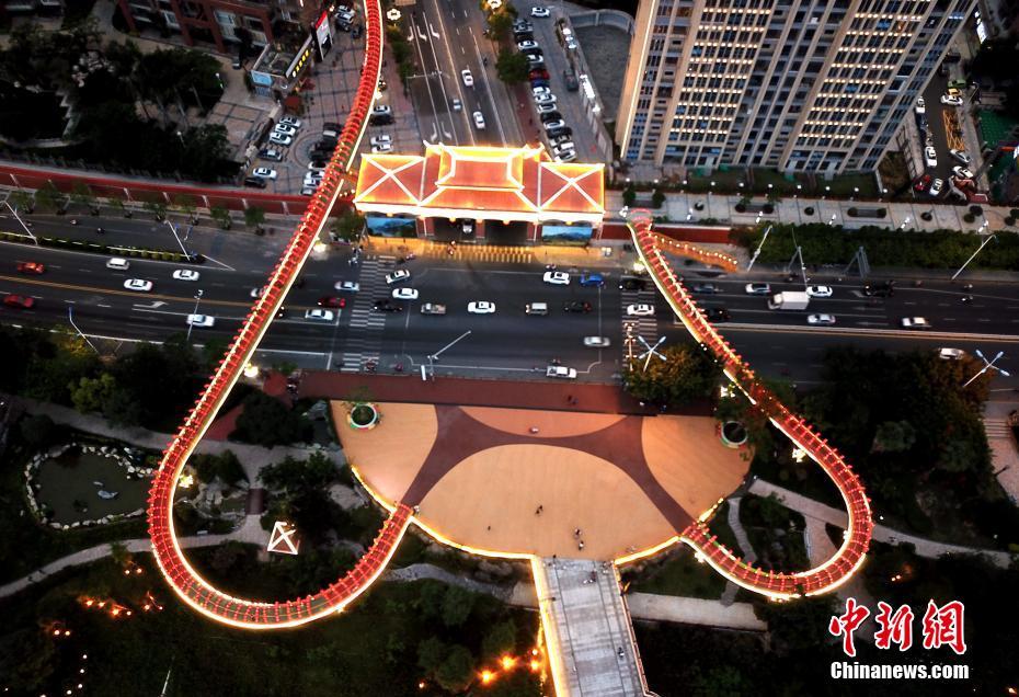 5月21日晚,空中鸟瞰福建省漳州市区里的“飘带”天桥。“飘带”天桥,全长约500米,宛如一条五彩缤纷的彩带悬在空中。天桥北接漳州古城,南连南山桥,将一江两岸、古城、古寺、古桥连为一体。 中新社记者 王东明 摄