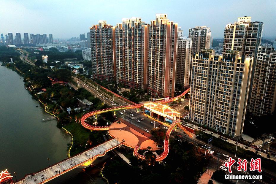 5月21日晚,空中鸟瞰福建省漳州市区里的“飘带”天桥。“飘带”天桥,全长约500米,宛如一条五彩缤纷的彩带悬在空中。天桥北接漳州古城,南连南山桥,将一江两岸、古城、古寺、古桥连为一体。图为“飘带”天桥周边高楼林立。 中新社记者 王东明 摄