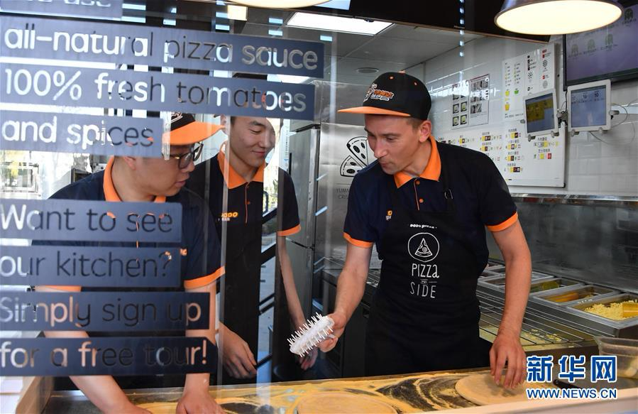 安德烈在披萨店与店员们一起制作披萨(4月11日摄)。在山东省烟台市莱山区烟台大学附近,一家来自俄罗斯的连锁披萨店味美达披萨,不时吸引着过往行人。店主是38岁的安德烈·普拉霍拉维齐。安德烈来自俄罗斯符拉迪沃斯托克市,是味美达披萨大中国区的主要合作伙伴,这家店是他在中国开设的第一家披萨店。新华社记者 徐速绘 摄