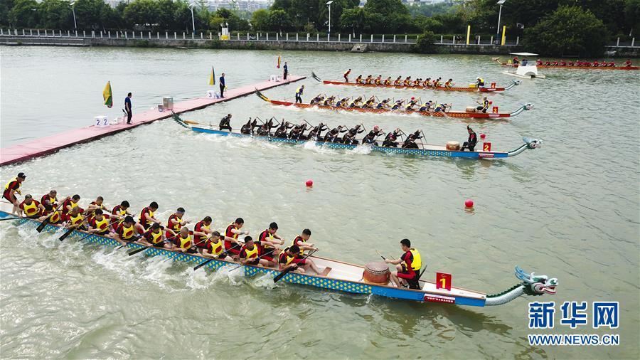 5月26日,参赛龙舟在浙江省温州市会昌湖水面上比拼。当日,浙江温州第五届龙舟联赛的一场比赛在会昌湖水上公园龙舟基地举行。众多龙舟同场竞技,上演了精彩的水上比拼。 新华社发(苏巧将 摄)