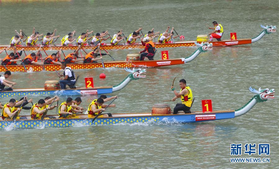 5月26日,参赛龙舟在浙江省温州市会昌湖水面上比拼。当日,浙江温州第五届龙舟联赛的一场比赛在会昌湖水上公园龙舟基地举行。众多龙舟同场竞技,上演了精彩的水上比拼。 新华社发(苏巧将 摄)