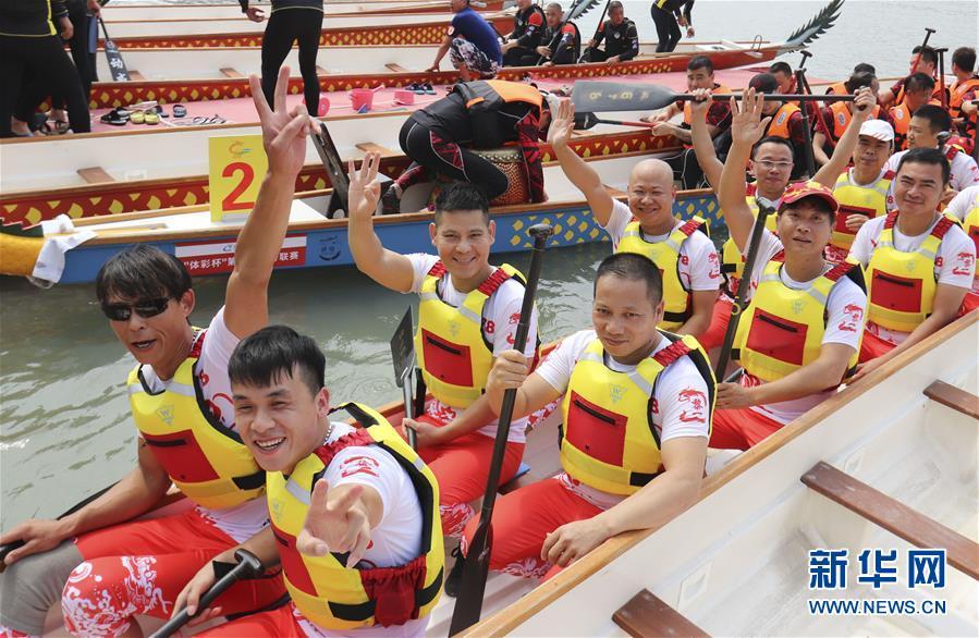 5月26日,参赛选手在浙江省温州市会昌湖水面准备出发。当日,浙江温州第五届龙舟联赛的一场比赛在会昌湖水上公园龙舟基地举行。众多龙舟同场竞技,上演了精彩的水上比拼。 新华社发(苏巧将 摄)