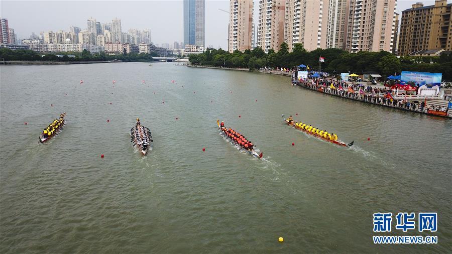 5月26日,参赛龙舟在浙江省温州市会昌湖水面上比拼。当日,浙江温州第五届龙舟联赛的一场比赛在会昌湖水上公园龙舟基地举行。众多龙舟同场竞技,上演了精彩的水上比拼。 新华社发(苏巧将 摄)