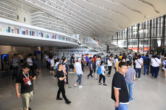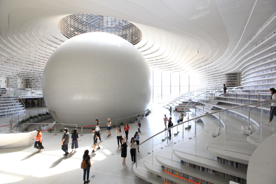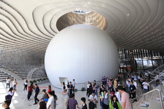 走进图书馆,大家就被这座“网红”图书馆所惊叹。纷纷停下来享受“旅行之阅、阅读之美”。这座长方体建筑被一个椭圆形的开口直接穿过。建筑内部,一个巨大的球形报告厅占据了大厅的中央位置,如同“天眼”凝视外界。环视四周,围绕报告厅逐级上升的阶梯与高挑的空间创造出丰富的层次感,带来如同海浪起伏般的景观效果……