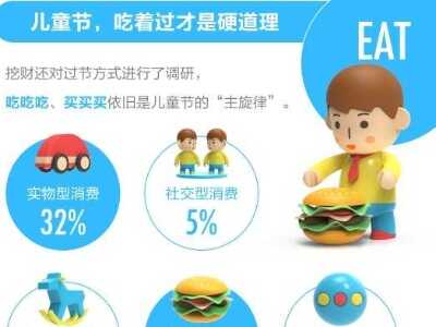 根据挖财记账软件给出的数据显示,全国家长为孩子支出的儿童节“过节费”平均为397元,而“吃”和“买”成为这个儿童节消费的主旋律。数据显示,过节费主要花费在玩具、服装等礼物的采购,以及餐饮、零食的支出,两部分的消费金额占总体消费的86%以上。