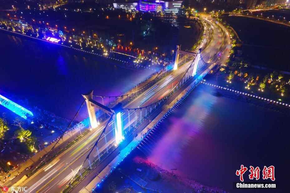 景观灯投射在水幕之上,变幻出紫、红、蓝、粉等多重色彩,炫目迷人。图片来源:东方IC 版权作品 请勿转载