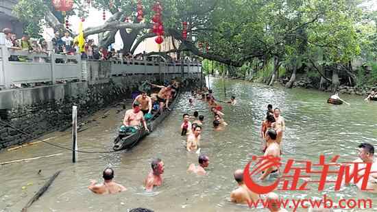 几十名赤膊男士跳下水,把藏在河涌之中的百年龙舟“唤醒”欧阳志强摄