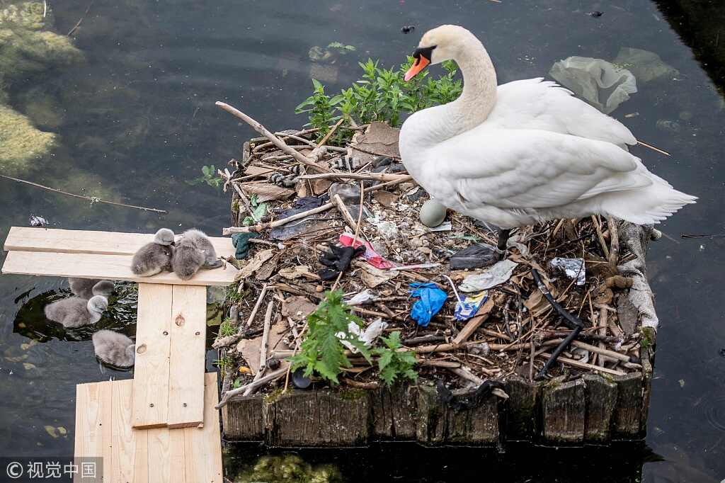 当地时间2018年5月28日,丹麦哥本哈根,露易丝女王大桥下的湖中,一只天鹅带着幼鸟在垃圾搭成的窝巢中生活。