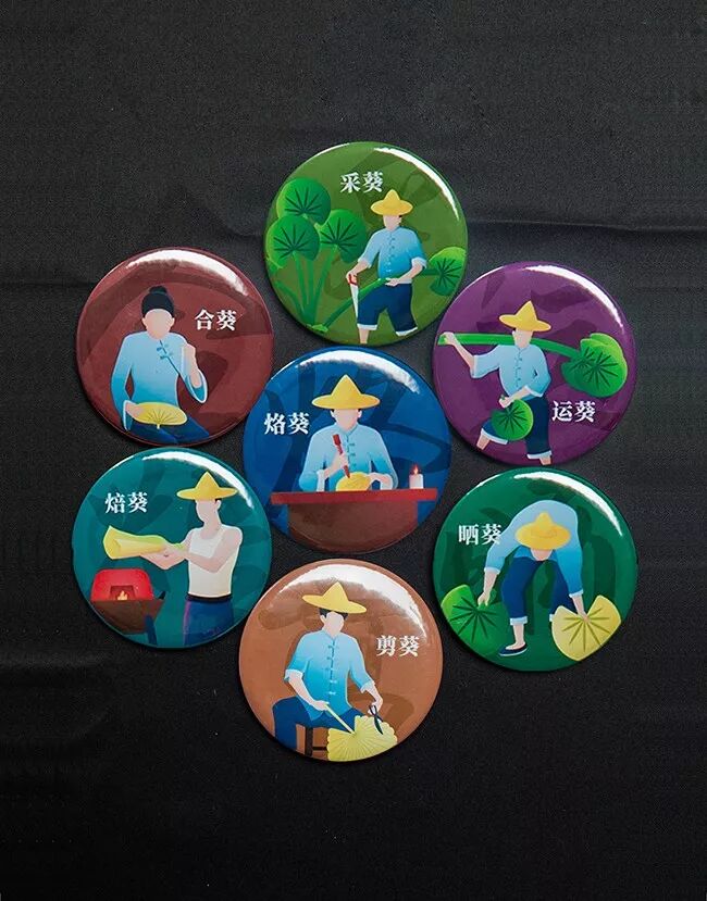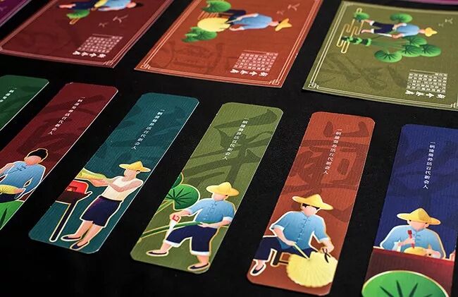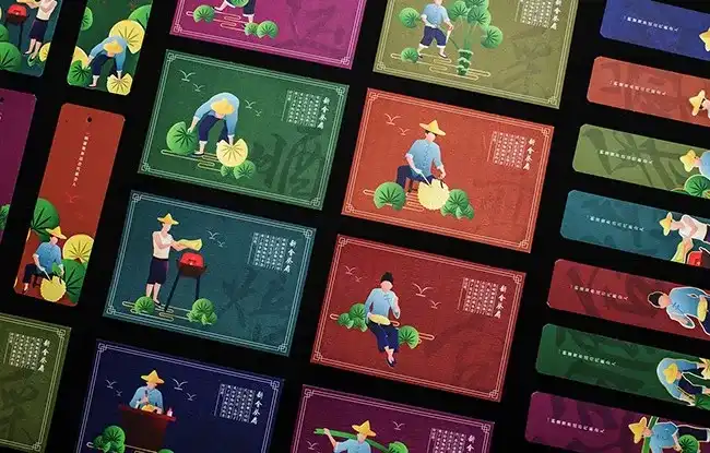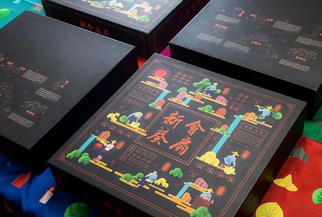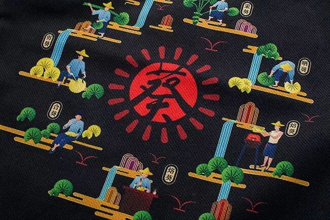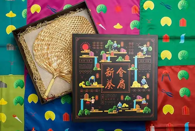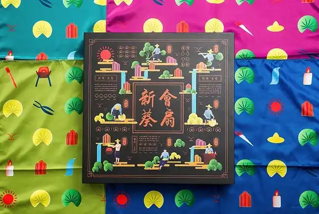 包装画面选用插画的形式表现,配色以黑为主,彩为辅。借鉴中国传统工笔画的手法,再结合现代的半偏平化风格设计,融入葵艺悠久的文化历史,进行创作。提取一些生活写照与制作工序相结合,象征着新会人民对葵扇最真最美好的寄托。