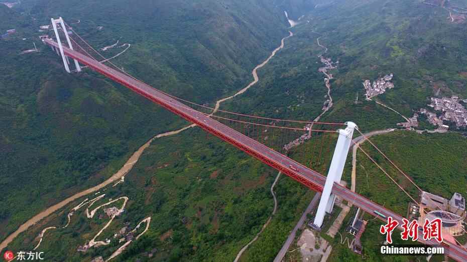 6月5日,无人机高空拍摄的贵州关岭坝陵河大桥,该桥宛若钢铁巨龙,横跨峡谷天堑,雄伟壮观。 坝陵河大桥位于贵州省安顺市高原重丘区关岭县关索镇,是沪瑞国道主干线上跨越坝陵河大峡谷的第一座特大型桥梁。该桥为主跨1088米的单跨钢桁加劲梁悬索桥,桥梁全长1564米,桥面至坝陵河水面370米,建成时是居"国内第一,世界第六"的大跨径钢桁梁悬索桥,是贵州有史以来修建的技术含量最高的桥梁。2017年11月,坝陵河大桥获得中国建设工程鲁班奖。秦刚 摄 图片来源:东方IC 版权作品 请勿转载