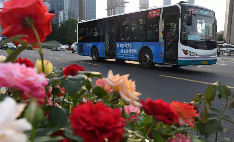 一辆带有上合组织青岛峰会标识的公交车行驶在青岛街头(6月4日摄)。新华社记者马宁摄