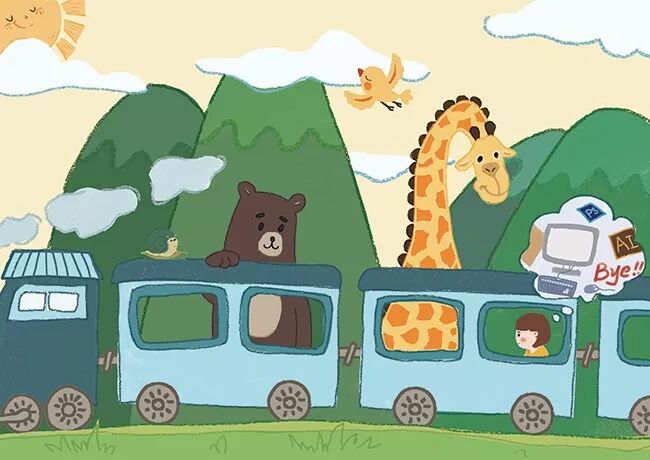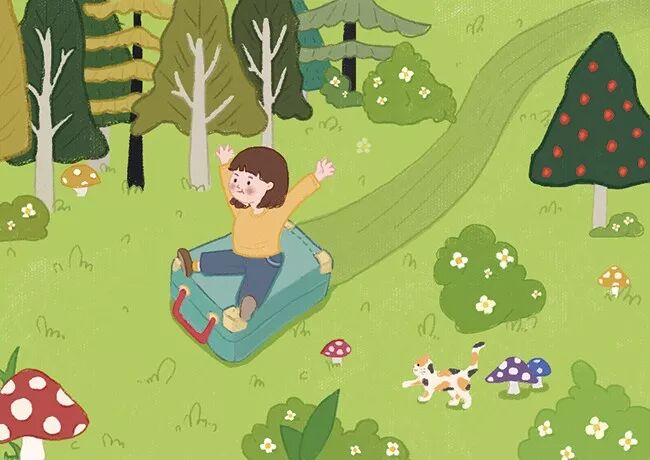 我们把插画的人物设定为一名正在城市里奋斗的女设计师,在她经历了长期的熬夜加班和与领导之间的摩擦之后,她决定离开城市,去看看大自然的风景。
