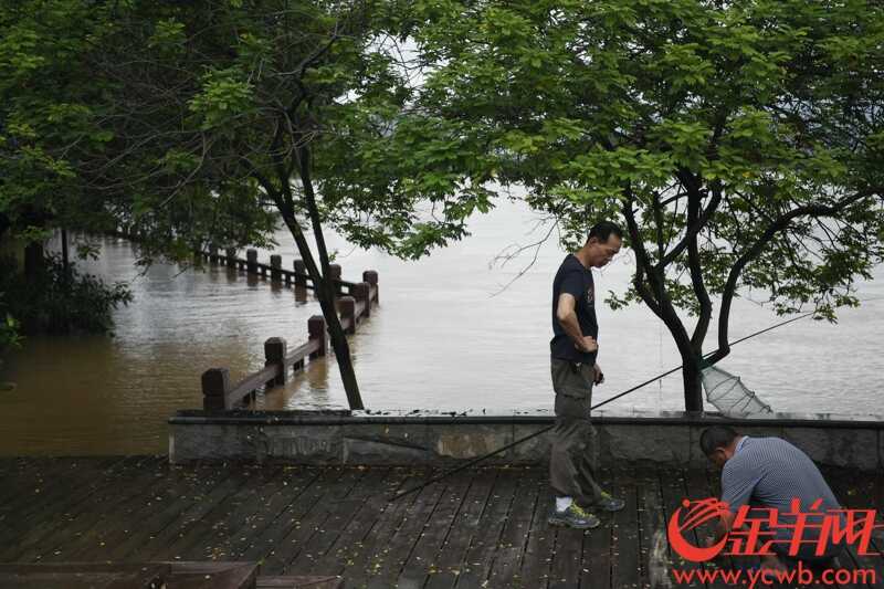 受台风“艾云尼”降水影响,今日(6月9日)上午10时,北江清远市区段水位高涨,清远市江滨公园观景长廊被水淹没。有市民趁着涨水在江边捕虾钓鱼。记者周巍摄