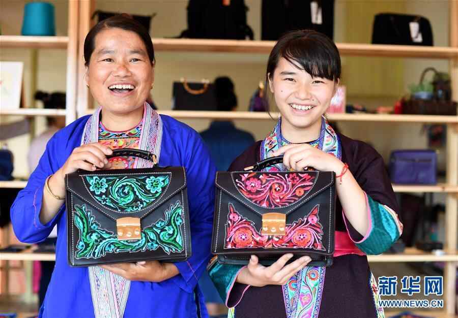 6月9日,在广西柳州市三江侗族自治县清花绣坊,滚培衣(左)和梁宏月展示由滚培衣刺绣作品制作而成的商品。新华社发(黎寒池 摄)