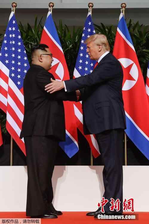 当地时间6月12日上午,朝鲜最高领导人金正恩与美国总统特朗普在新加坡嘉佩乐酒店举行首次会晤,双方握手致意。这是在任的朝美领导人数十年来首次会晤及握手。