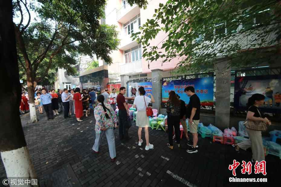 2018年6月13日,重庆,下午江北区某小学的大门口被排队报名的家长“攻陷”。学校围墙外已经挤满了前来排队报名的家长,大家都已经“全副武装”,带着小板凳,打着遮阳伞在烈日下排起了长队,每一个板凳上无一例外都写上了家长的姓名和联系电话。文字来源:重报移动传媒图片来源:视觉中国