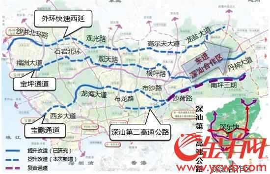 为均衡原特区外路网布局,增强高快速路对沿线的交通服务,进一步推动特区内外一体化发展,规划新增宝鹏、宝坪及外环快西延三条东西向通道,在市政化改造盐坝高速的同时,一并市政化改造原特区外纵向通道龙大高速和南光高速公路。