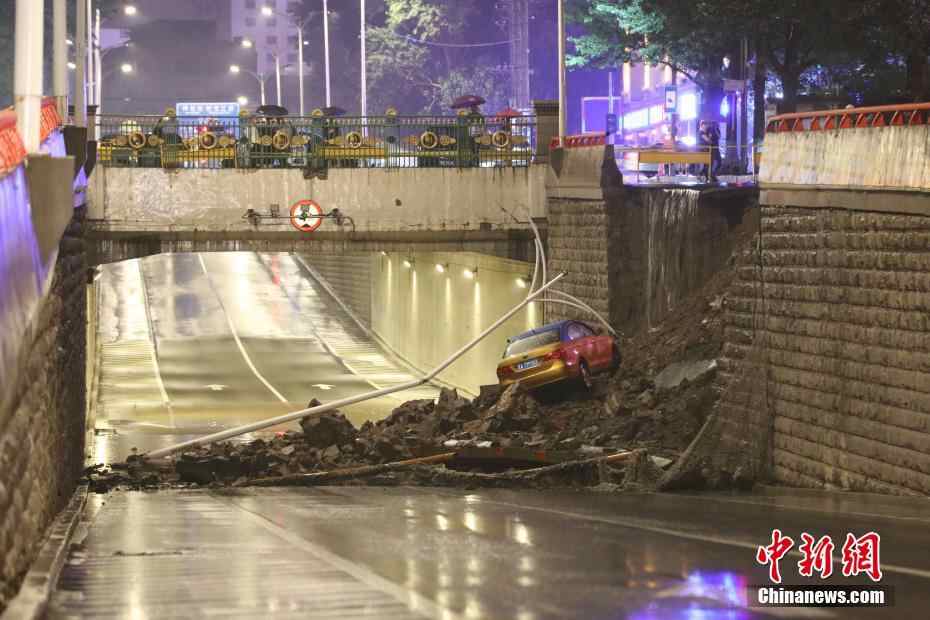 6月14日21时左右,哈尔滨市南岗区北京街(木介街向满洲里街方向)地下桥引桥一侧墙体发生坍塌。记者赶到现场看到,桥体上方一辆出租车也同时掉落到桥下,驾驶员与车内一名乘客轻微擦伤。目前,辖区交警已经在现场进行警戒,相关管护单位陆续赶到现场进行勘察。图为事故现场。 中新社记者 于琨 摄