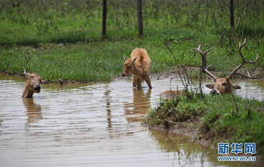 这是在洞庭湖麋鹿和鸟类救护避难所拍摄的被救助的麋鹿“点点”(左)、“犇犇”(右)和它们产下的小麋鹿(5月23日摄)。