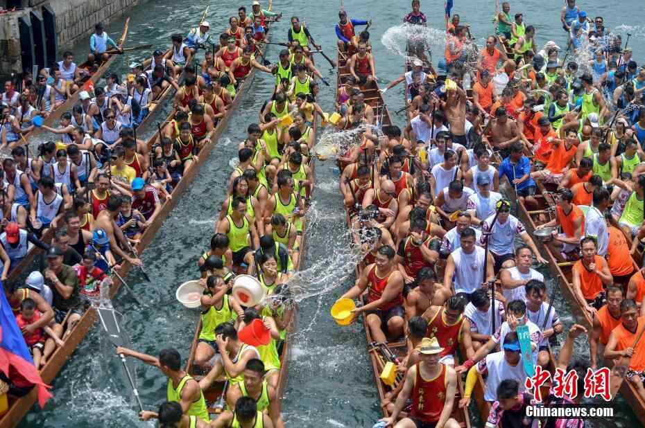 6月18日正值端午节,逾百年历史的香港仔龙舟竞渡大赛在香港仔避风塘举行。该龙舟赛是香港最具传统渔港特色的龙舟赛。全日赛事共33场,其中有十支大木龙舟队参加比赛,大龙参赛规模为全港之最。图为参赛选手在“颁大旗”仪式上泼水庆祝端午节。 中新社记者 张炜 摄