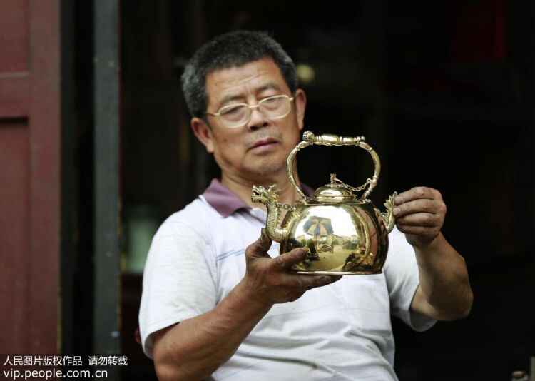 6月19日,谭福林在察看制作完工的手工铜壶。