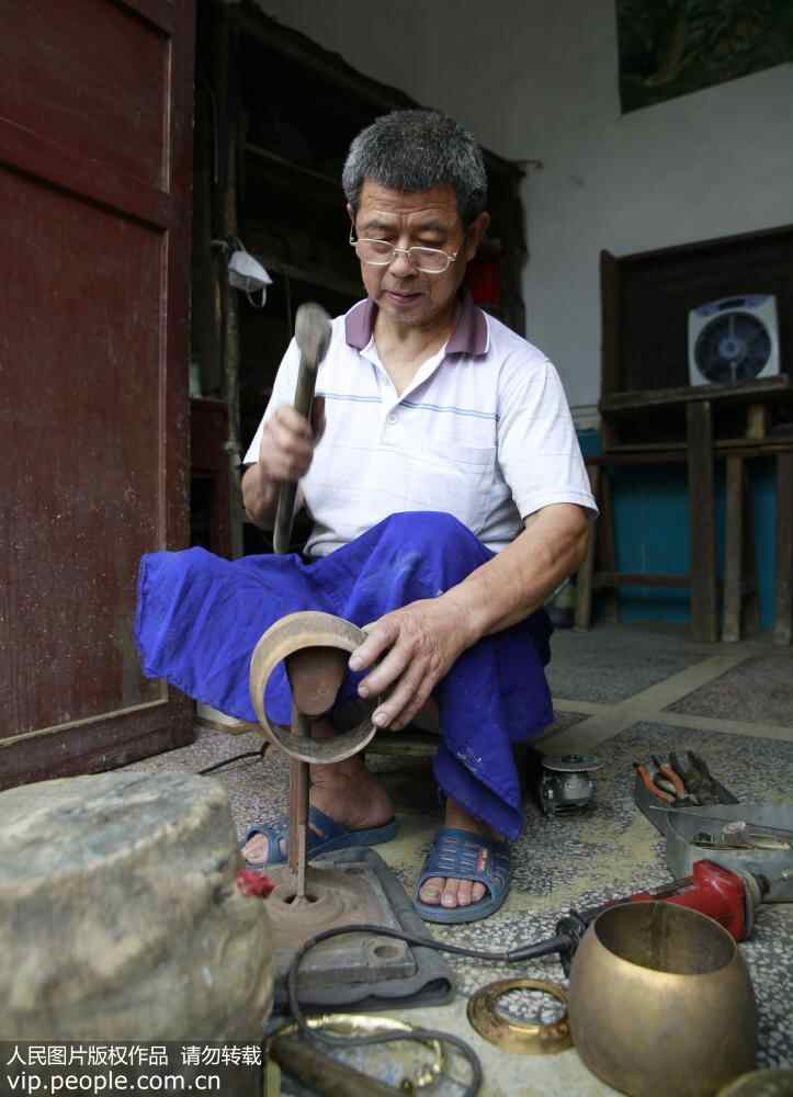 6月19日,民间工匠谭福林对铜壶进行捶型。