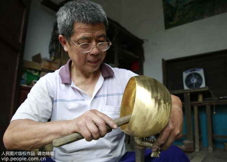 6月19日,民间工匠谭福林对铜壶进行捶型。