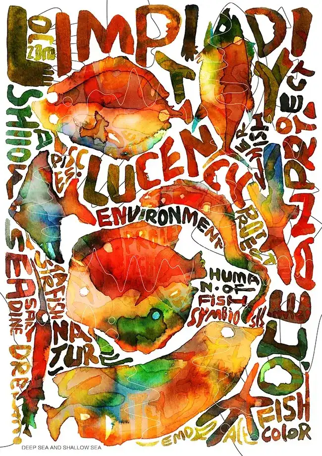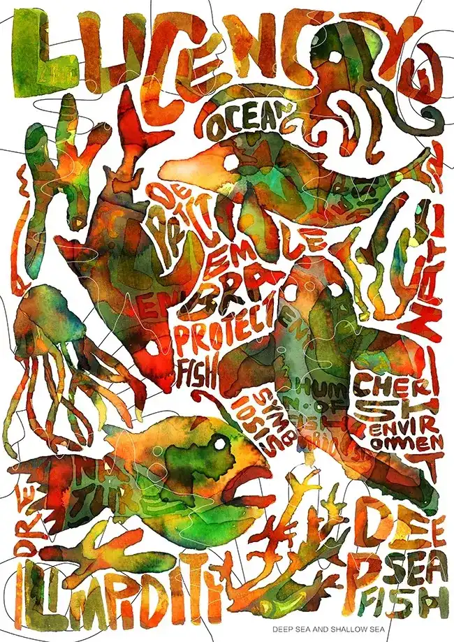 作品《Deep sea and Shallow sea》用彩色墨水手绘出两幅五彩斑斓的海洋世界,手绘内容分别是浅海的鱼类和深海的鱼类。两幅海报的内容又相互交融,浅海区的鱼群和深海区的鱼群彼此相互交融、滲透,表达着干净清澈的海水能让我们更加清晰的欣赏这片蓝色星球,更加深度的了解这篇美丽的海洋世界。同时呼吁我们人类积极保护我们的海洋,保护海洋生物。