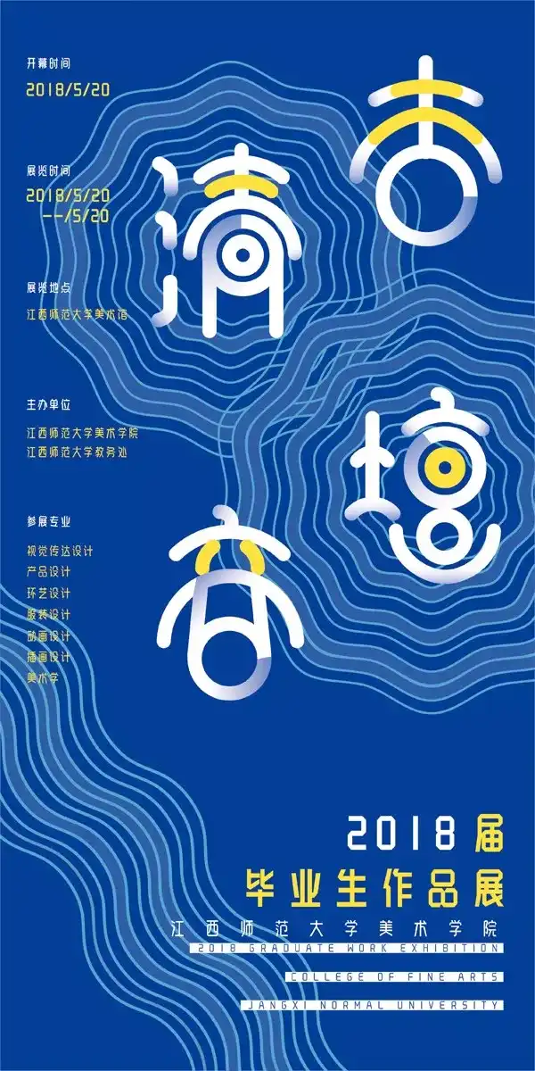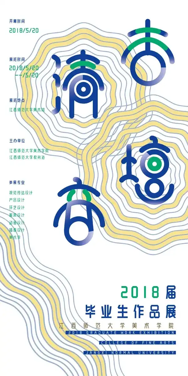 本作品为“2018届江西师范大学本科生毕业展”海报。海报的主题为“杏坛清音”,杏坛是孔子教学的地方,清音则比喻老师对学生的教导。海报的四个主体字采用对篆书字体进行变形设计,衬托海报的文化气息,四个主体字的部分笔画用不同的颜色表现出“二〇一八”四个字。背景线圈状图形营造出声音传播的视觉感受,并且组成“1”和“8”两个阿拉伯数字,对应18届毕业生。颜色采用较为亮丽的配色,衬托出大学生的青春气息。