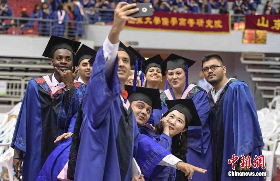 6月23日,山东大学2018年毕业典礼暨学位授予仪式在济南举行,外国留学生拍创意毕业照庆祝毕业。 中新社记者 张勇 摄