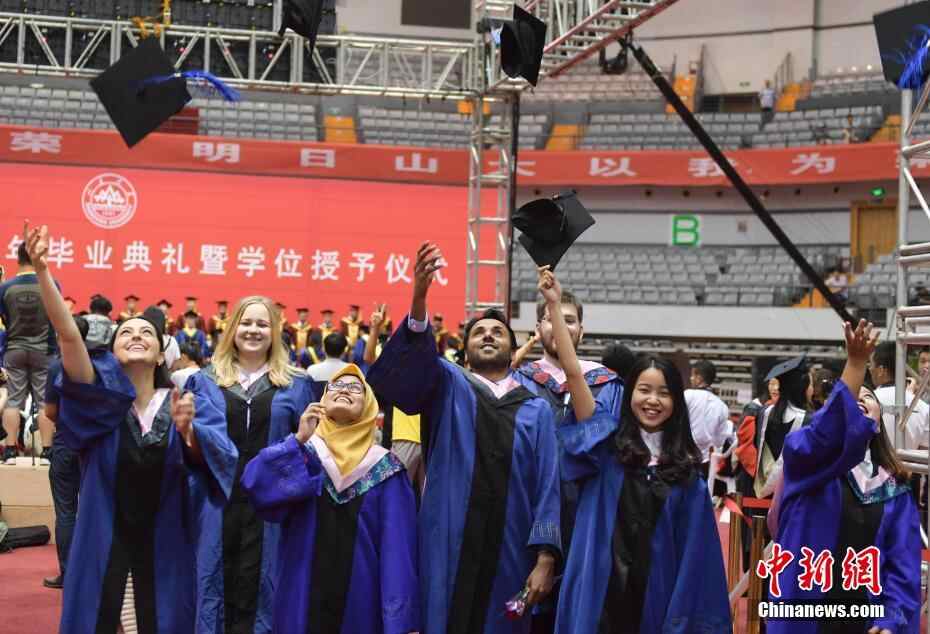 6月23日,山东大学2018年毕业典礼暨学位授予仪式在济南举行,外国留学生拍创意毕业照庆祝毕业。 中新社记者 张勇 摄