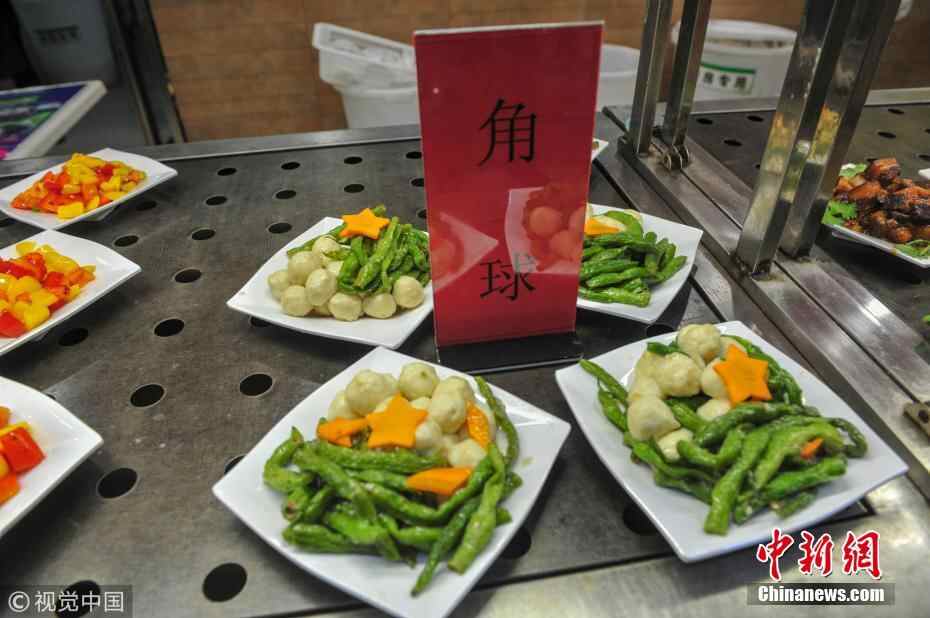 一道取名“角球”的菜,鱼丸象征着足球,而豆角与鱼丸炒在一起便是“角球”。图片来源:视觉中国