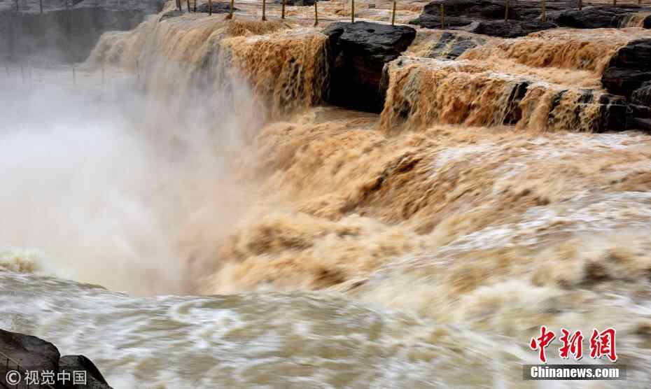 近日,山西临汾,受上游局部地区强降雨影响,山西吉县黄河壶口瀑布出现西边浊浪翻滚、东边白浪滔滔的奇特景观,吸引了众多游客前来观看。图为游客在山西吉县欣赏黄河壶口瀑布半清半浊景观。 图片来源:视觉中国