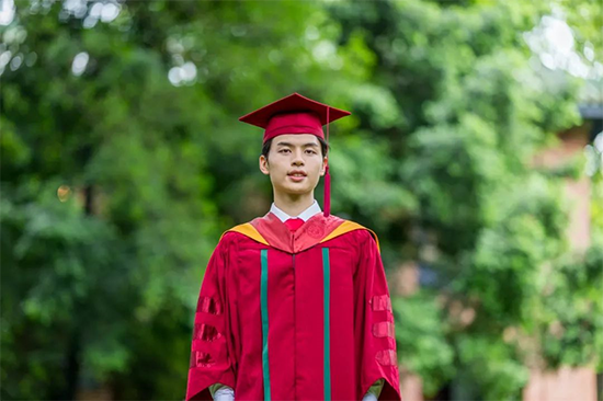 学位袍内搭带有领子的白衬衫,整齐、干净。