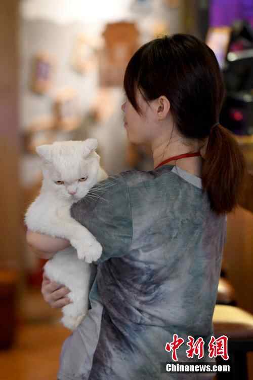 7月6日,一家以宠物猫为主题的饮品店亮相广西南宁市,顾客可在店内喝冷饮的同时与猫咪玩耍互动,吸引爱猫人士前往体验。图为顾客与猫咪互动。中新社记者 俞靖 摄