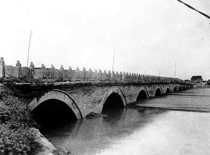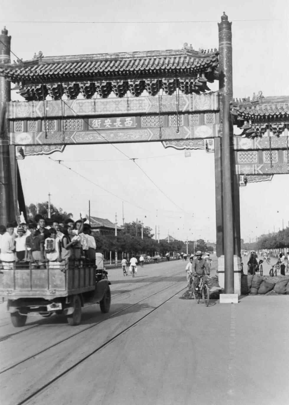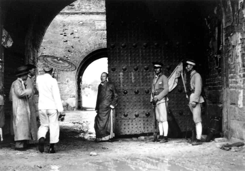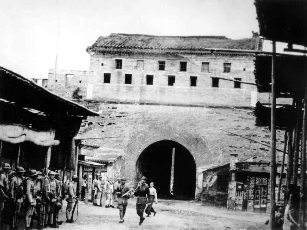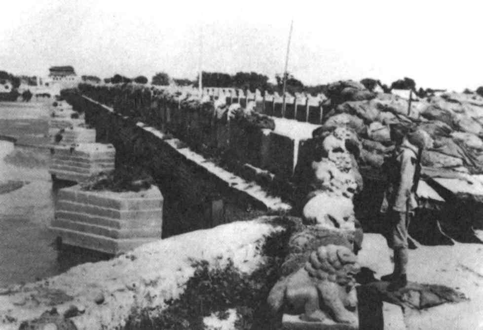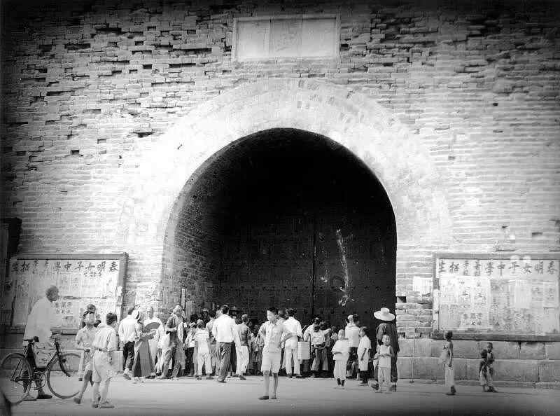 卢沟桥事变后的第二天,宛平城门口警戒的士兵和入城的民众