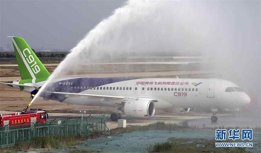 7月12日,在山东东营胜利机场,消防车喷射水柱迎接C919大型客机102架机。当日,C919大型客机102架机从上海浦东机场起飞,历经1小时46分的飞行,平稳降落在山东东营胜利机场,顺利完成首次空中远距离转场飞行。这意味着C919大型客机项目进入密集研发试飞新阶段,正式开启多地同步试飞模式,未来将接受各种复杂气象条件的考验和系列高风险试飞科目的挑战。此次转场东营试飞基地的102架机主要承担动力装置、电源系统、环控系统等地面试验验证和试飞科目。新华社发(周广学 摄)