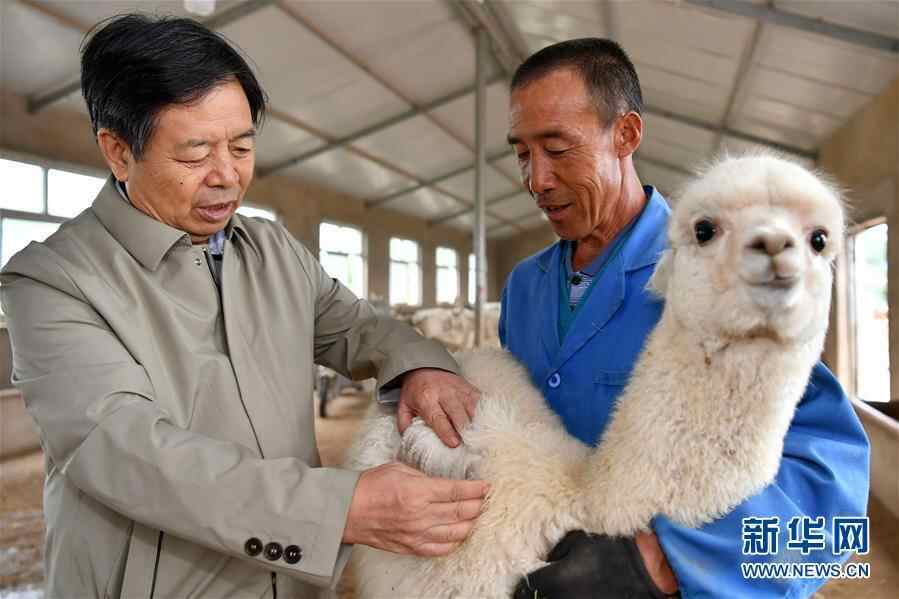 山西阳曲县杨兴乡坪里村村民刘学荣(右)协助山西农业大学董常生教授为小羊驼体检(7月10日摄)。山西阳曲县杨兴乡坪里村的农民刘学荣做梦都没想过,一群从澳大利亚远道而来的“呆萌”羊驼能帮助他脱贫致富。新华社记者 曹阳 摄 图片来源:新华网