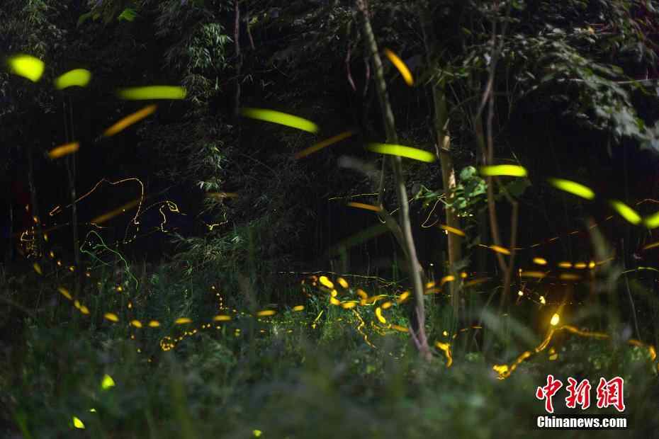 7月20日晚,重庆一农场内的各种类萤火虫在森林里共舞,如同梦幻场景。有的萤火虫能感应到游客的拍手声,随着节奏一闪一闪地呼应;有的萤火虫附着在游客的衣服上,如同一套夜光礼服;更多的是害怕光源的萤火虫,连普通的手机屏幕光源都会对它产生刺激。萤火虫的最佳观赏时间为晚上8点30分至9点30分。 陈超 摄
