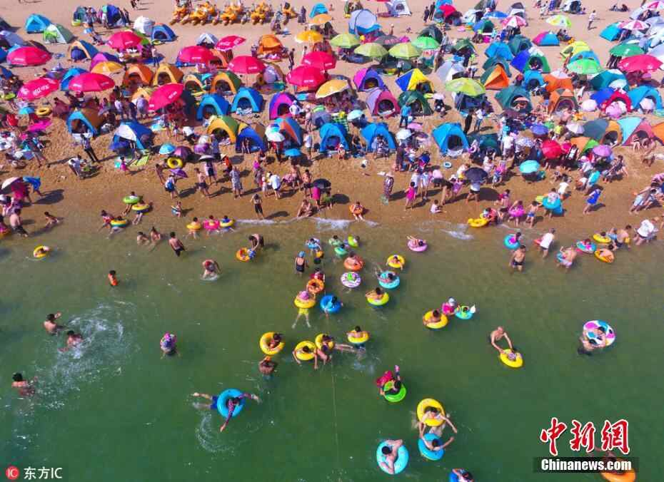 2018年7月22日,约4万游客聚集到大连市付家庄海滨浴场消暑避夏整个海滩如同“下饺子”。当日大连天气晴好,又恰逢周末,而且该海滨浴场是距离市区最近的免费海水浴场,约4万人云集到付家庄海滨浴场在海滩上支起花花绿绿的帐篷,到大海里畅游,整个海滩如同“下饺子”般热闹。图片来源:东方IC 版权作品 请勿转载