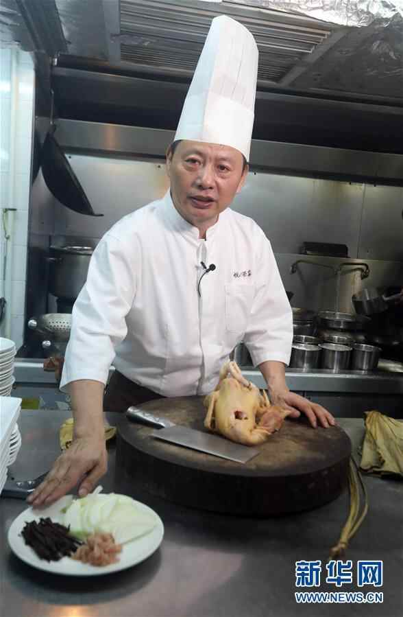 杭州酒家老板吴瑞康向记者介绍“叫化鸡”的制作工序(6月16日摄)。