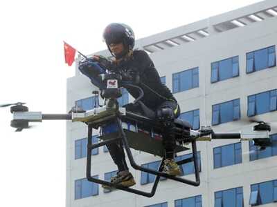 只见他身穿机车服,戴上头盔,跨坐在一台巨型八旋翼飞行器。飞行器上不仅有坐垫,还有仪表盘、操作台。赵德力跨上飞行器,启动开关,八架螺旋桨立时快速旋转起来,掀起的气流吹得草丛东歪西倒。大约10秒,飞行器便升到空中,飞行高度约6米左右,可进可退,可左可右,还可悬停空中。因为要维持机身平衡,赵德力需要身体前倾,紧靠机身龙头把手,保持一个姿势。