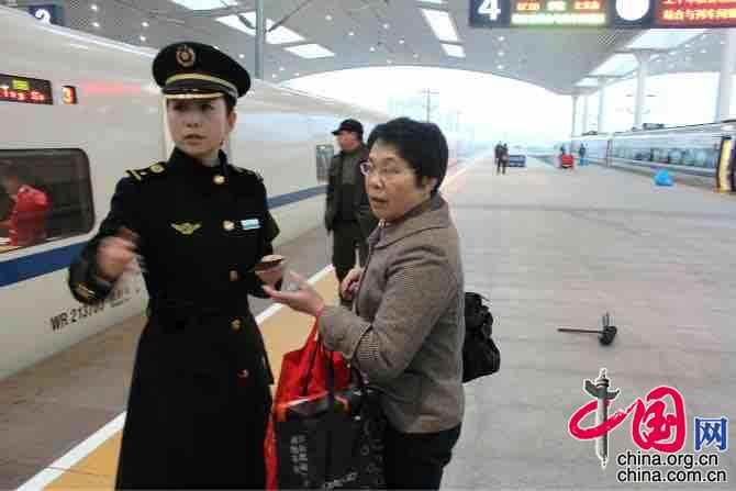2011年冬赵小琴在北京南开往福州的D365次列车值乘时解答乘客问题。2007年4月18日零时实施的第六次中国铁路大提速后,赵小琴就被调到动车车组进行值乘,车型的改变让赵小琴感觉很多内容需要重头学起。在动车组开通后,很多旅客有新鲜感,会有很多问题问乘务员,这就要求她们不仅需要提升服务意识,还要拓展自己的知识面,除了熟悉新车型外,还要对沿途新建的高铁车站有所了解,这样才能更好的为乘客解答问题。(受访者供图)