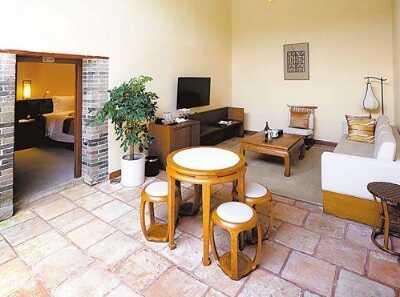 跨过清代的门楼,穿过它前面的一片晒谷场,长约百米的成排围龙屋的正中间的祠堂就是酒店主入口。踏进趟栊门,以祠堂为中轴,对称横纵向两列的围龙屋以方形围合而成一个四合院式的客家古村落。曾经是世世代代村民生息的围龙屋现在改造、重建为33间有厅有卧室有卫浴的套房或别墅,而祠堂除了上堂仍为村民办婚嫁节庆活动外,其他部分成为酒店的前台、大堂,还有茶室、书屋、儿童活动室、咖啡吧、健身房。