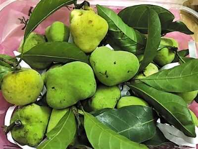 在东莞道滘镇小河村炯叔的农场里,十几株挂满了“狗囊”果的桂木树,叶子与菠萝蜜非常相似,不挂果时很难分辨。据炯叔介绍,桂木树是前几年引进种植的,因为很怀念小时候吃这种水果的味道而引进种植。只见桂木果形状不太规则,因为样子像狗的生殖器官而得名“狗囊”。刚摘下来的桂木果是不能即时吃的,那些乳白色的树胶又苦又涩,或用苹果、香蕉等放在一起催熟,经过几天工夫,待皮黄果软,散发出酸甜的味道才好吃。因为物以稀为贵,炯叔家的桂木果每斤售价30元,也有不少尝鲜客。